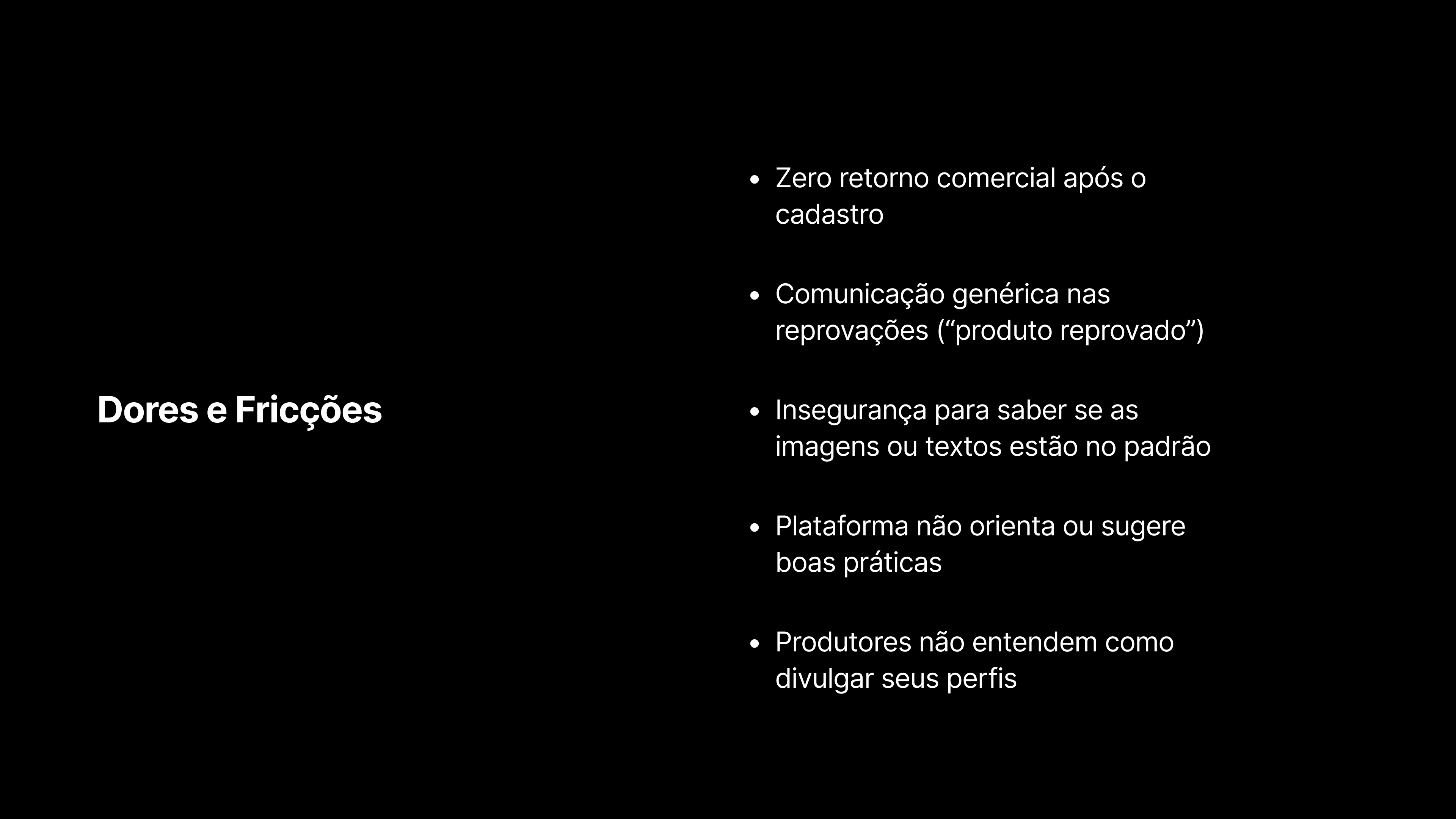 A fase de discovery foi conduzida para compreender as razões por trás dos comportamentos observados. Foram realizadas entrevistas em profundidade com produtores de diferentes regiões do país. Um dos participantes mencionou desafios logísticos e a necessidade de fortalecer a presença digital. Outro destacou que o cadastro na plataforma não resultou em retorno comercial. Já um terceiro avaliou o processo como intuitivo, mas apontou lentidão na curadoria e a ausência de dados sobre os negócios gerados.